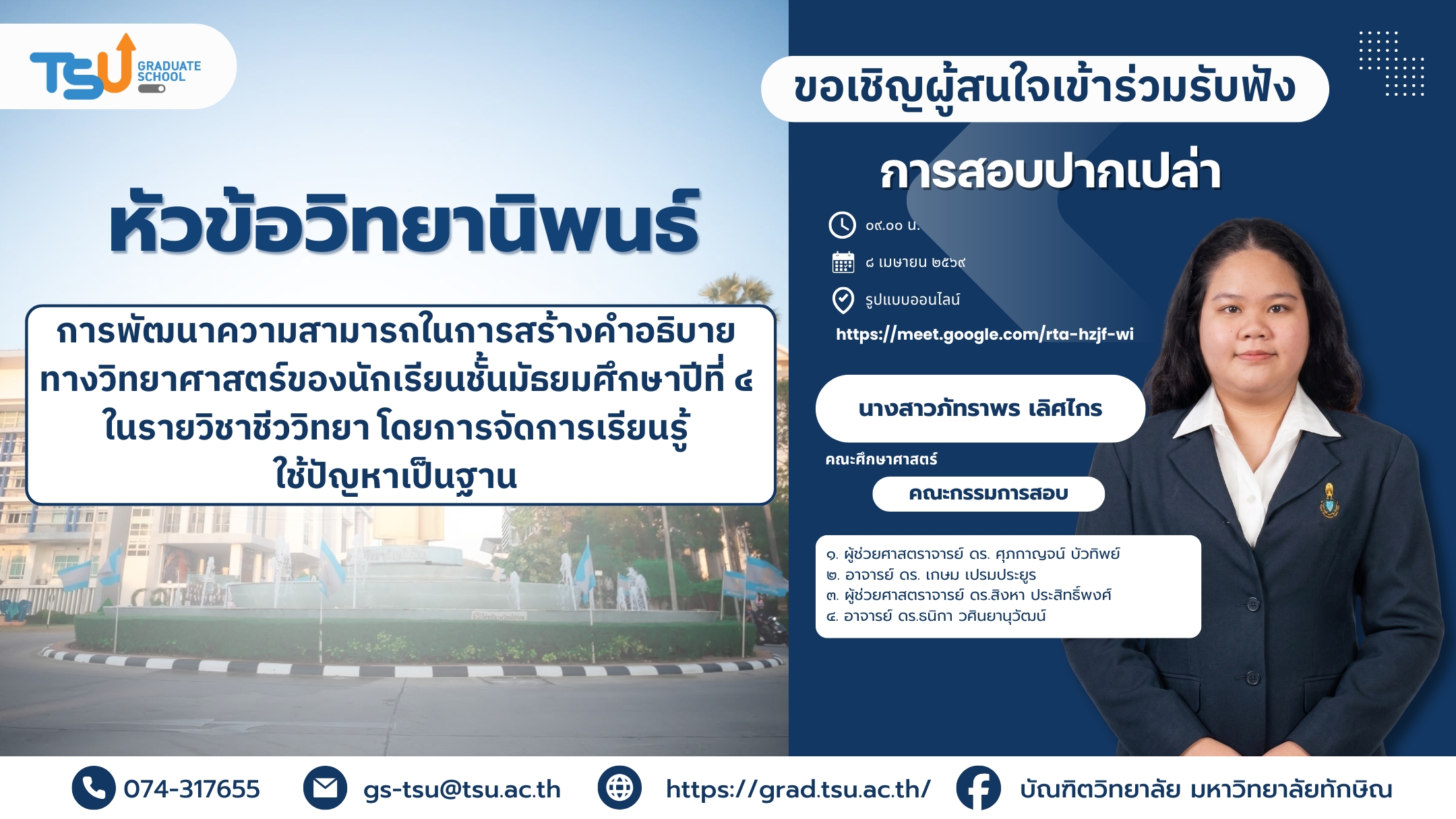 บัณฑิตวิทยาลัย มหาวิทยาลัยทักษิณ ขอเชิญผู้สนใจเข้าร่วมรับฟังการสอบปากเปล่า