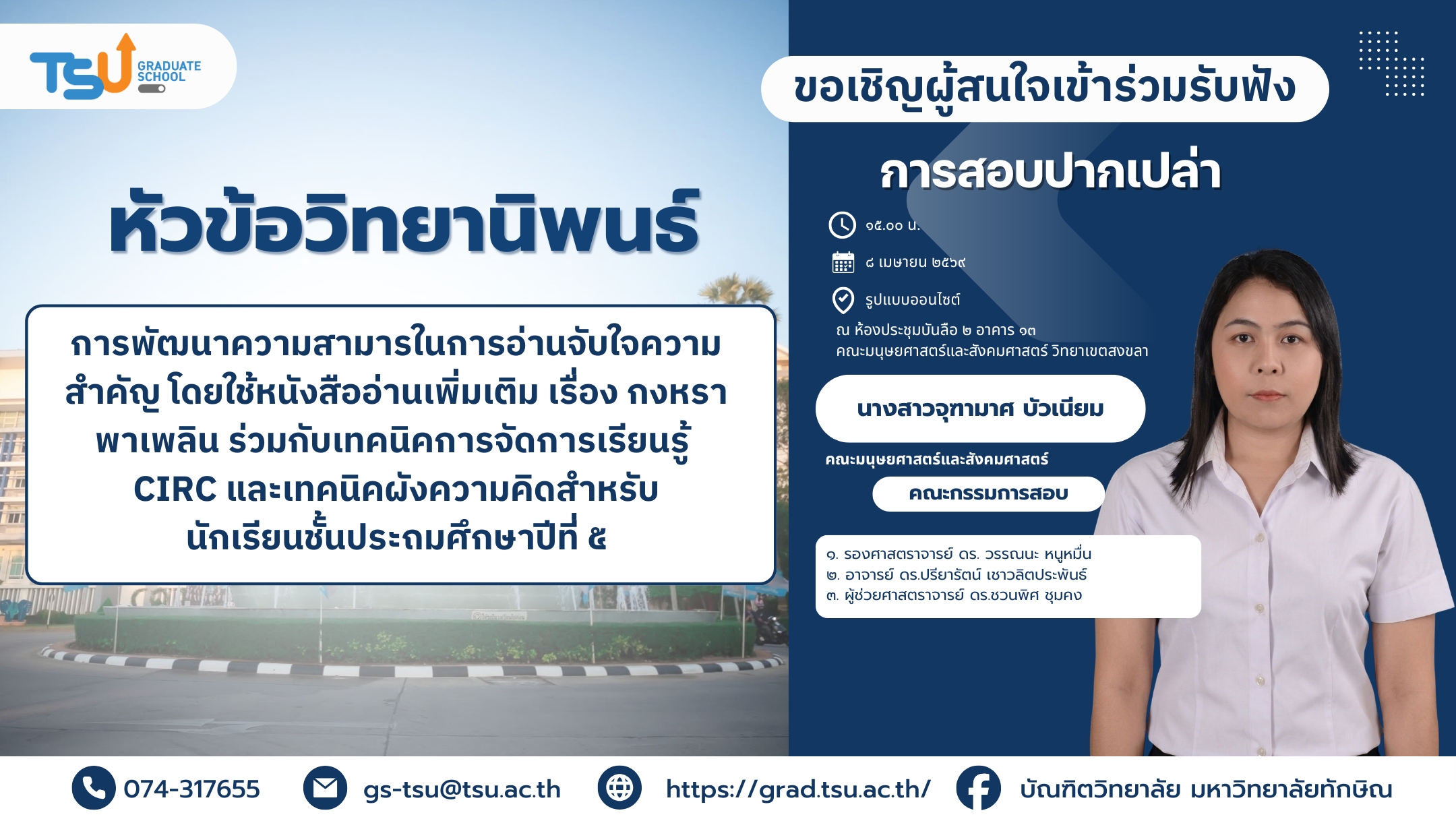 บัณฑิตวิทยาลัย มหาวิทยาลัยทักษิณ ขอเชิญผู้สนใจเข้าร่วมรับฟังการสอบปากเปล่า